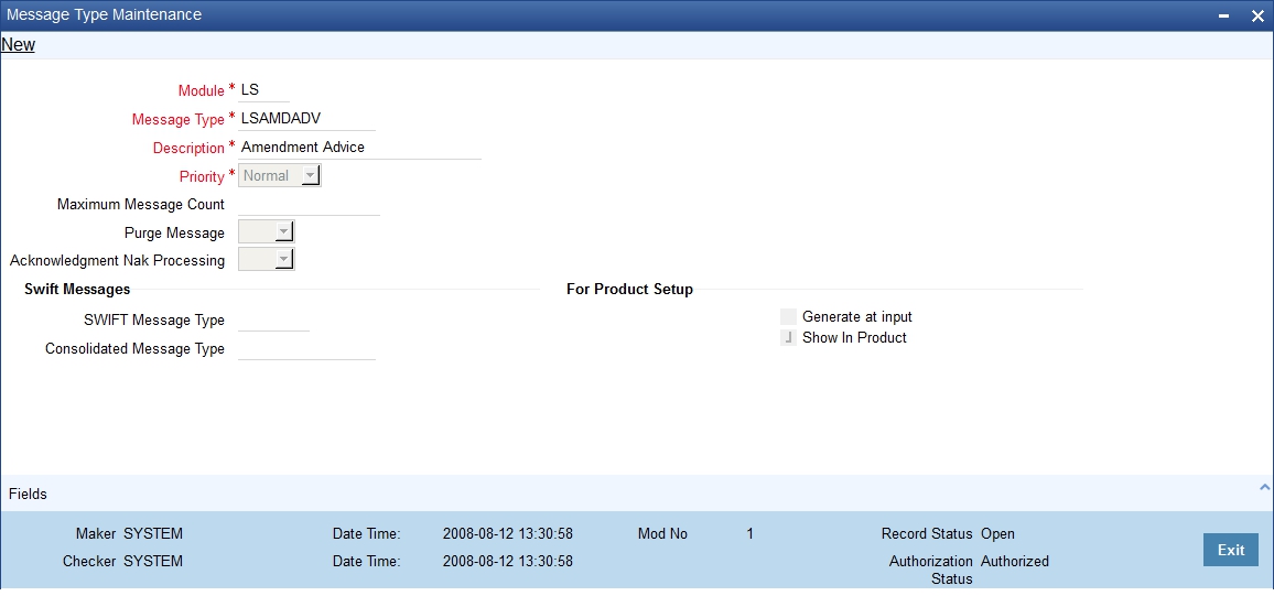 You can maintain message types in Oracle FLEXCUBE through the ‘Message Type Maintenance’ screen. To invoke ‘Message Type Maintenance’ screen, type ‘MSDMSTYM’ in the field at the top right corner of the Application tool bar and click the adjoining arrow button.