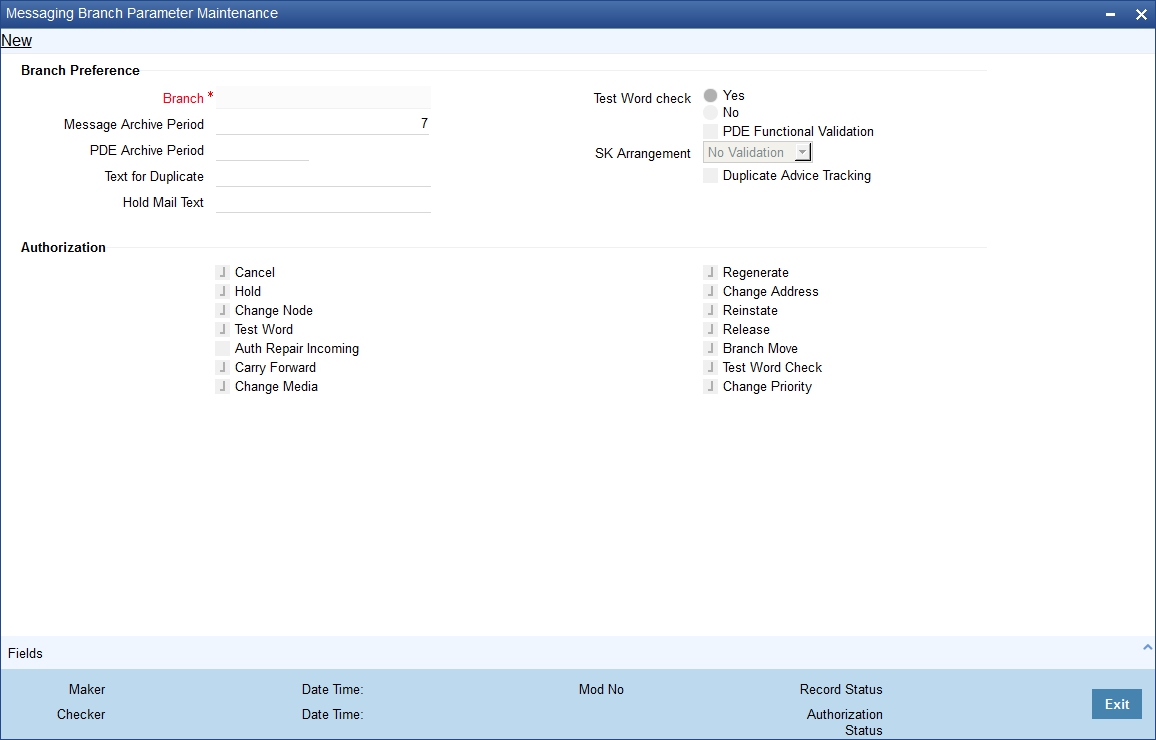 If you are maintaining preferences for a new branch of your bank, click the ‘New’ button on the Application toolbar. The ‘Messaging Branch Parameters Maintenance’ screen is displayed without any details.