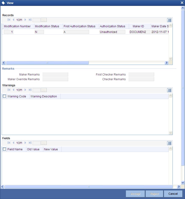 To view the changes made on a particular date, double-click the ‘View Changes’ button corresponding to the desired date under ‘Maker Date Stamp’. A detailed screen appears containing changes made on the given date.