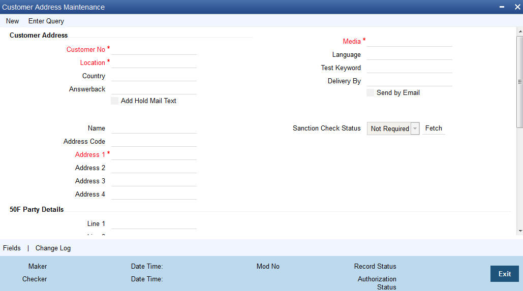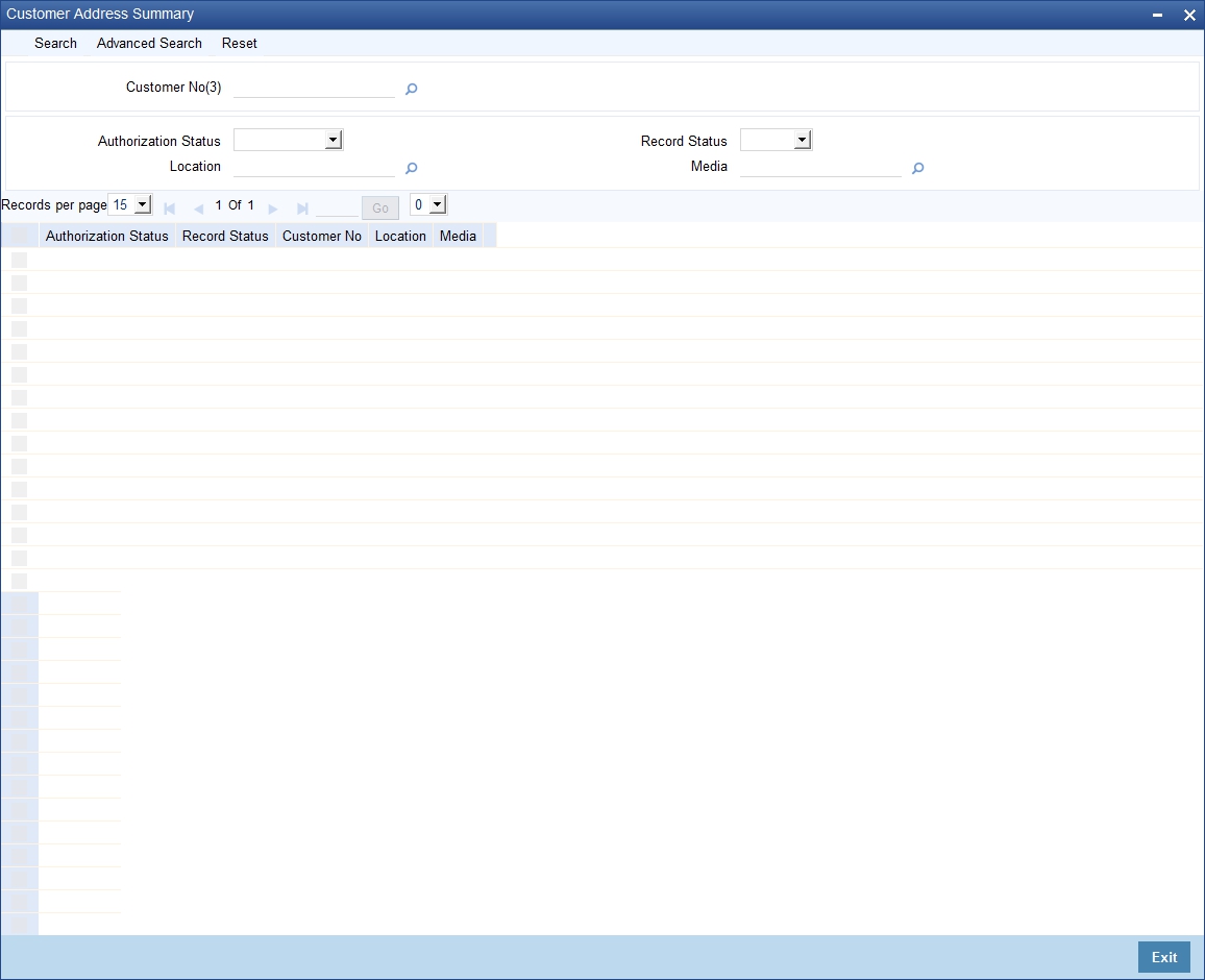 After you have made the mandatory entries, save the record. A customer address record that you have created should be authorized by a user, bearing a different Login Id, before the End of Day (EOD) process can begin. Click ‘Exit’ or ‘Cancel’ to return to the Application Browser.