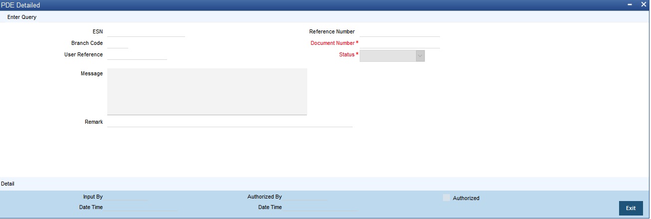 In order to view the details of the record click ‘Detail’ button. The details of the record are displayed in the ‘PDE Detail’ screen.