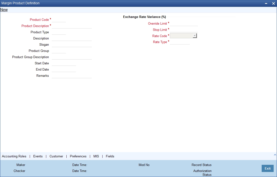 A margin product is created in the Head Office branch of your bank. Any user in the head office, with the requisite rights, can create a product.