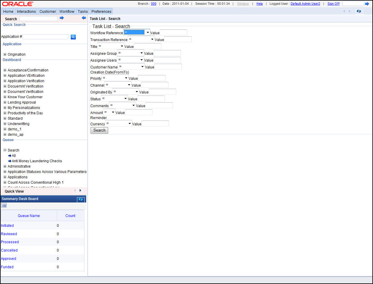 The page that is displayed on invoking the application is called as the ‘Landing Page’. As mentioned above, you can launch a search for a particular task on the basis of the fields displayed in the Task List pane under the ‘All’ sub-menu in the ‘Search’ main menu item. The fields under this sub-menu (All) are pre-defined in the system and represent all process flows. The search fields under the ‘All’ sub-menu are displayed as shown in the screen below: