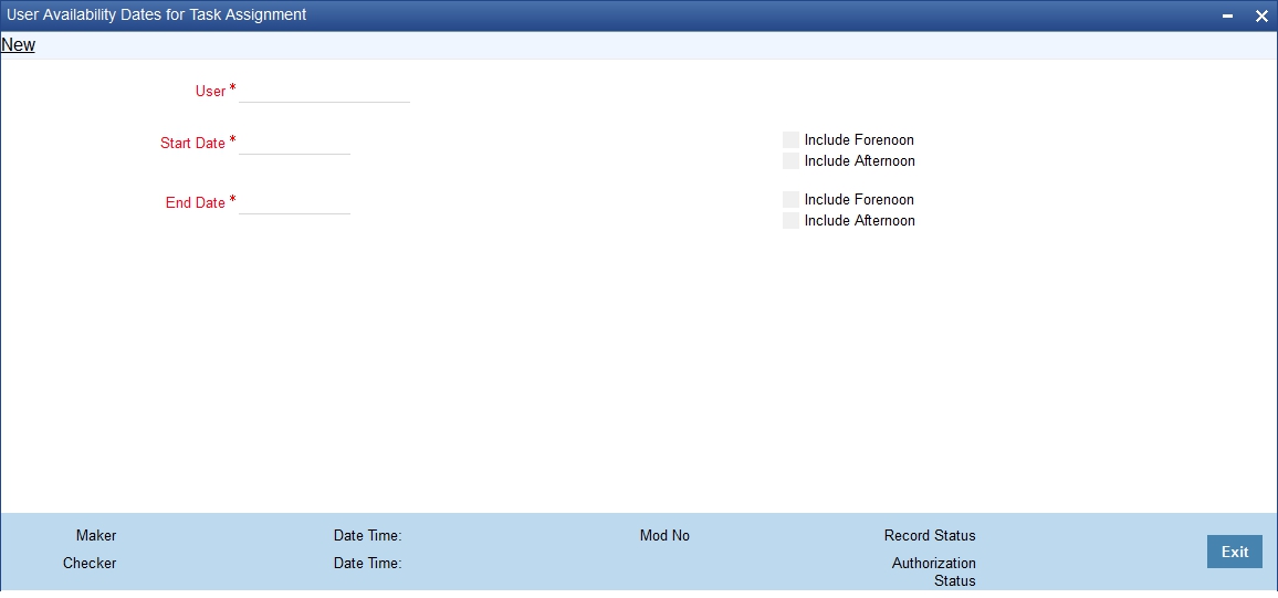You can maintain the user availability details to handle different tasks in ‘User Availability’ screen. In the user availability screen you can maintain forenoon and afternoon sessions during which the user will not be able to handle the tasks. To invoke this screen, type ‘ORDCACUA’ in the field at the top right corner of the Application tool bar and click the adjoining arrow button.