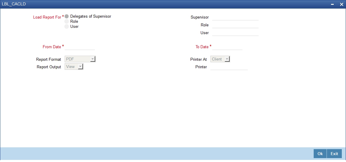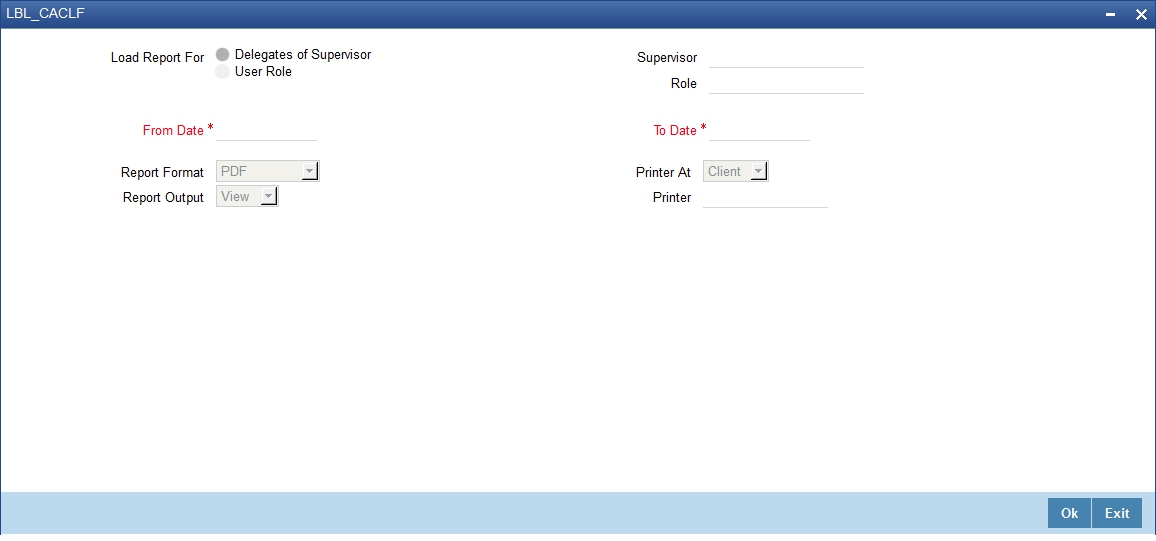 This report lists the number of pending and completed tasks assigned to each user and and a load factor which indicates the percentage of group tasks assigned to user during the specified period. You can invoke this screen by typing ‘ORRCACLF’ in the field at the top right corner of the Application tool bar and clicking on the adjoining arrow button.