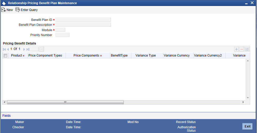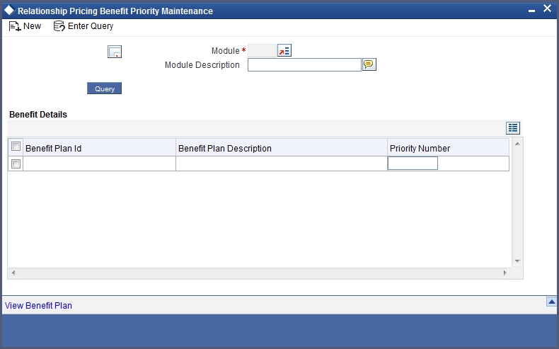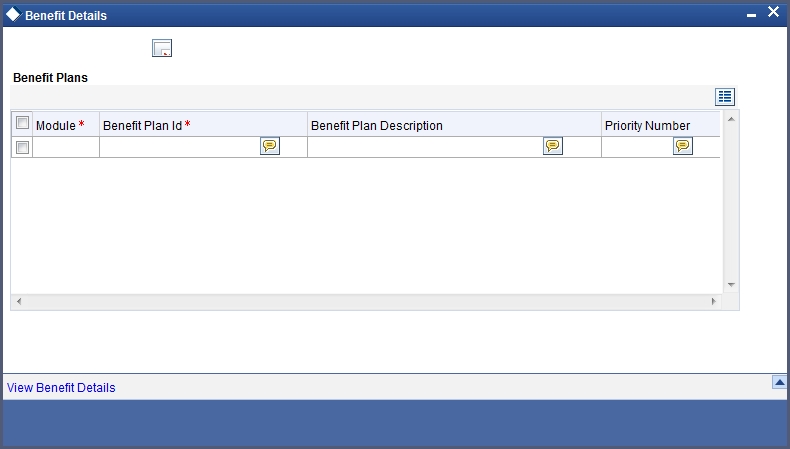Select a row in ‘Benefit Details’ and click the ‘View Benefit Details’ button to view the details associated with the selected benefit plan. Thesystem displays ‘Relationship Pricing Benefit Plan Maintenance’ screen.