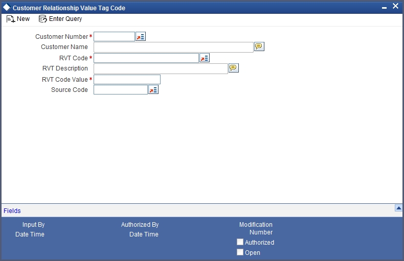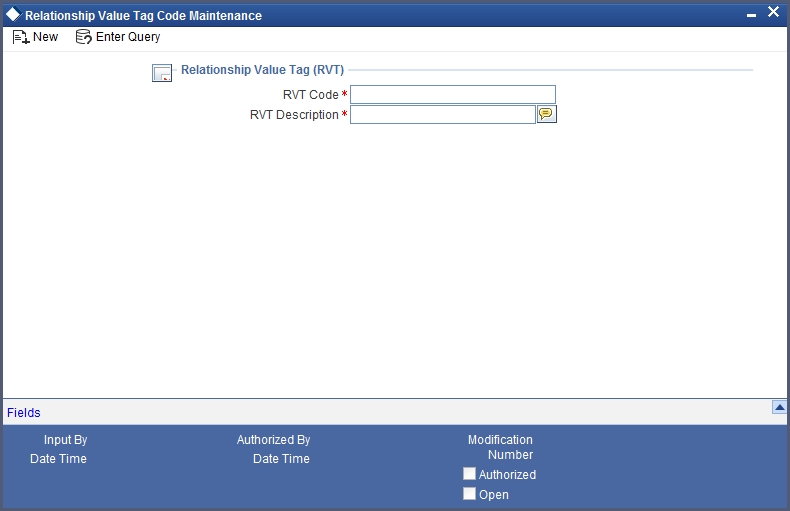 You can maintain the values for the relationship tags either manually or you can upload the same from an external system. You can maintain the values manually using the ‘Customer Relationship Value Tag Code Maintenance’ screen.