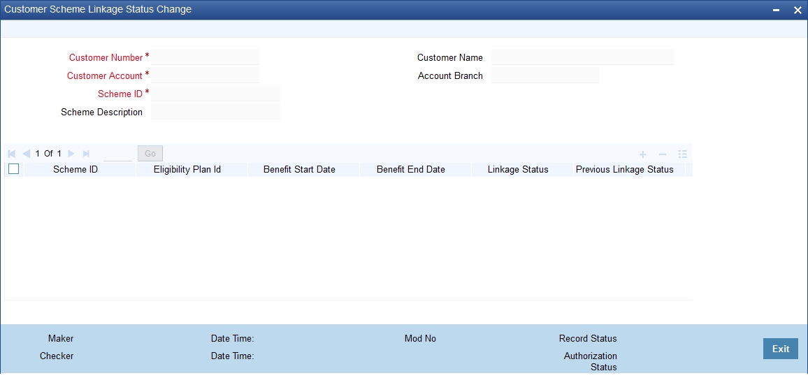 You can view and change the status of customer scheme linkages in the ‘Customer Scheme Linkage Status Change’ screen. All the schemes linked to the customer are displayed in this screen, with the respective status.