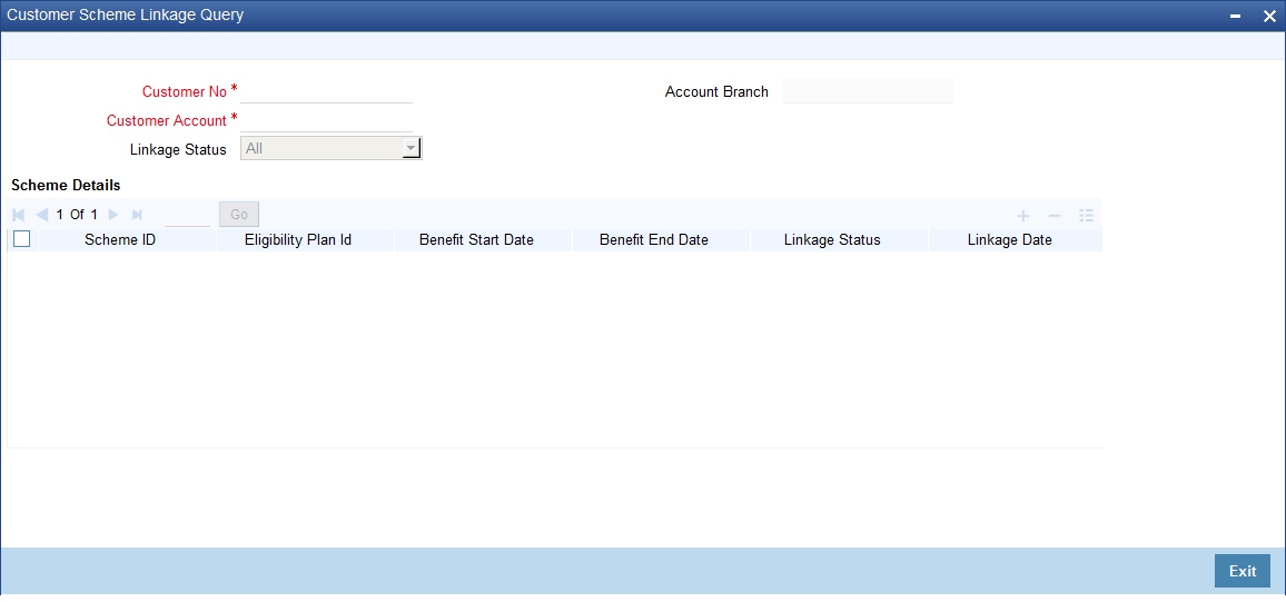 You can view the schemes linked to a customer number in ‘Customer Scheme Linkage Query’ screen. You can invoke this screen by typing ‘CODSCLQY ’ in the field at the top right corner of the Application tool bar and clicking the adjoining arrow button.