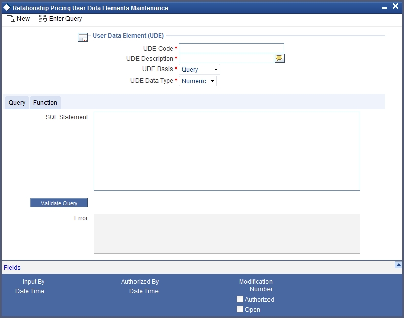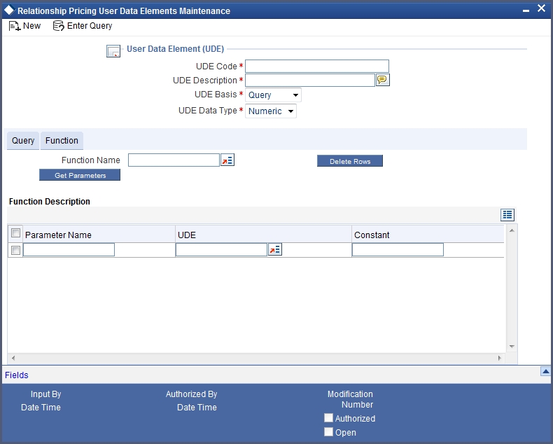 You can maintain the data elements to be used to compose pricing scheme rules in ‘Relationship Pricing – User Data Elements’ maintenance screen. You can invoke this screen by typing ‘CODUDEMT’ in the field at the top right corner of the Application tool bar and clicking the adjoining arrow button.