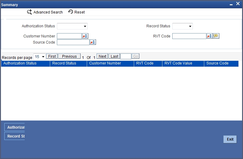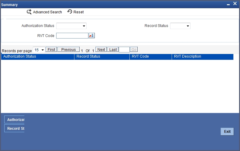 You can view the details of the RVT code and also search for a desired code in the ‘Relationship Value Code Maintenance Summary’ screen. You can also invoke this screen by typing ‘COSRVTMT’ in the field at the top right corner of the Application tool bar and clicking the adjoining arrow button.