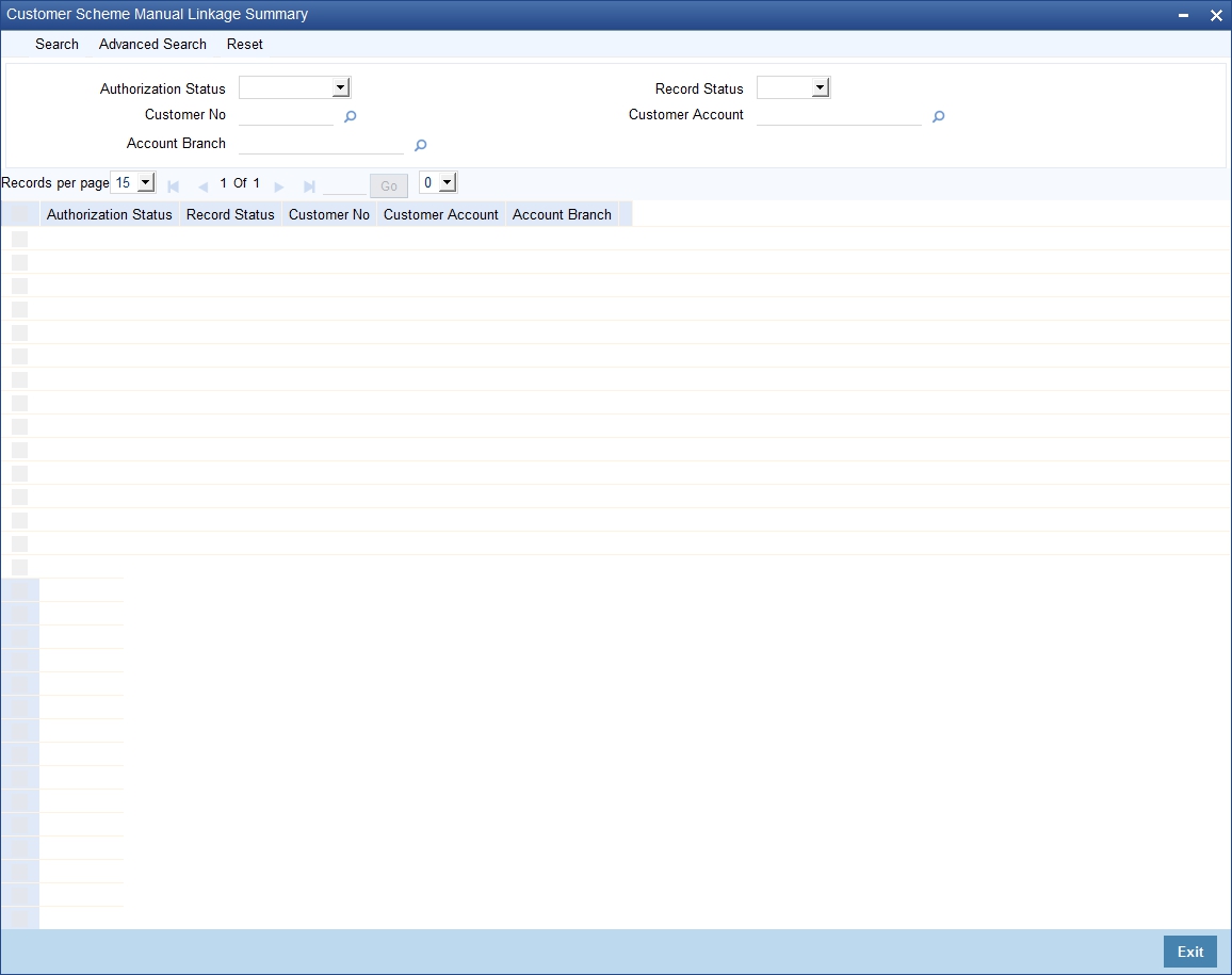 You can view the details of customer scheme linkages and also search for a customer in the ‘Customer Scheme Manual Linkage Summary’ screen. You can invoke this screen by typing ‘COSCUSML’ in the field at the top right corner of the Application tool bar and clicking the adjoining arrow button.