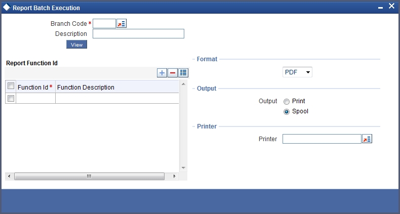 Using this screen, you can view, print or spool the reports maintained for each branch. You need to specify the branch code to initiate the process.