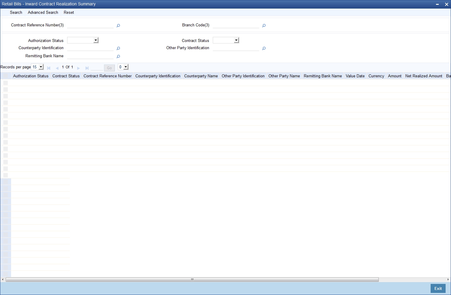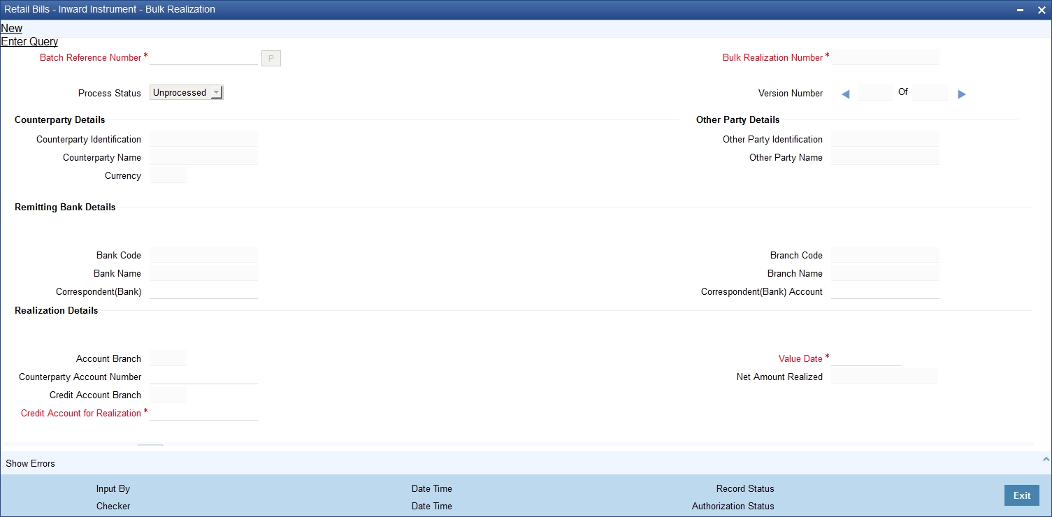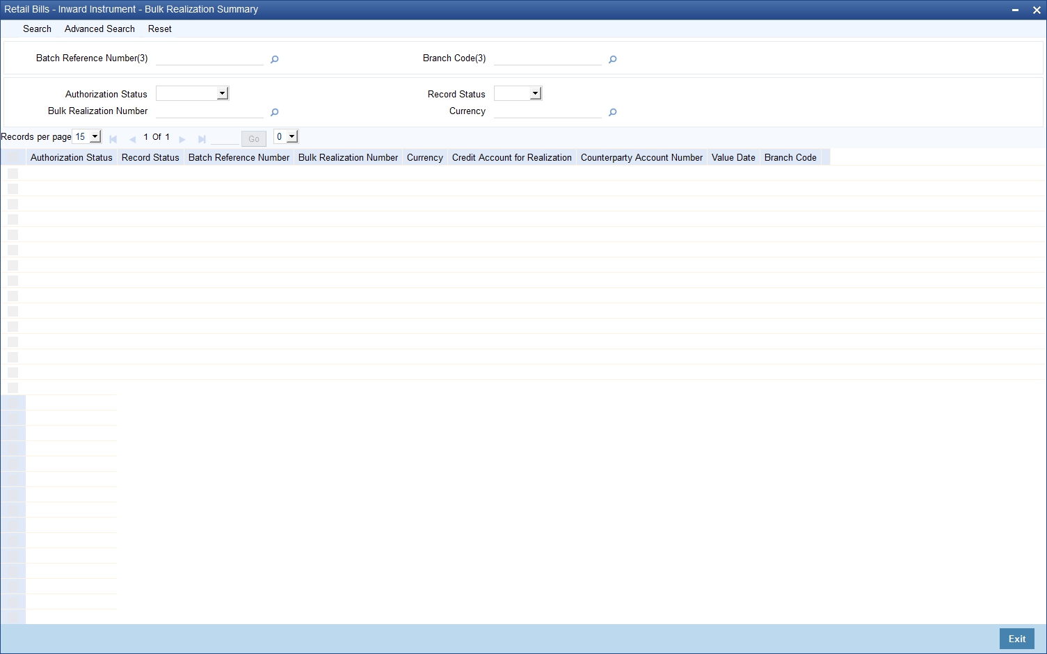 You can realize the inward retail instruments in a bulk using 'Retail Bills-Bulk Inward Bill Realization Details' screen. You can invoke this screen by typing ‘RBDBIREA’ in the field at the top right corner of the Application tool bar and clicking on the adjoining arrow button.