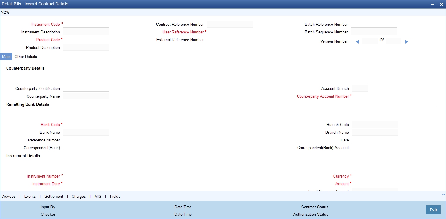 You can create an inward retail bill/cheque for collection using the ‘Retail Bills-Inward Contract Details’ screen. You can invoke the Contract input screen by typing ‘RBDICONL’ in the field at the top right corner of the Application tool bar and clicking on the adjoining arrow button.