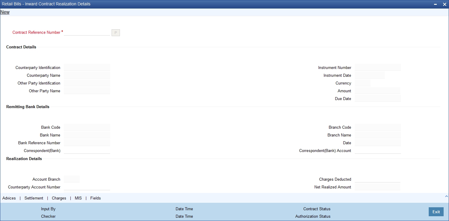 For any Inward Contract you create in Oracle FLEXCUBE, you can define generic attributes, such as Advices, Events and Settlements, MIS details, Charge details etc, by clicking on the appropriate icon in the horizontal array of buttons in this screen.