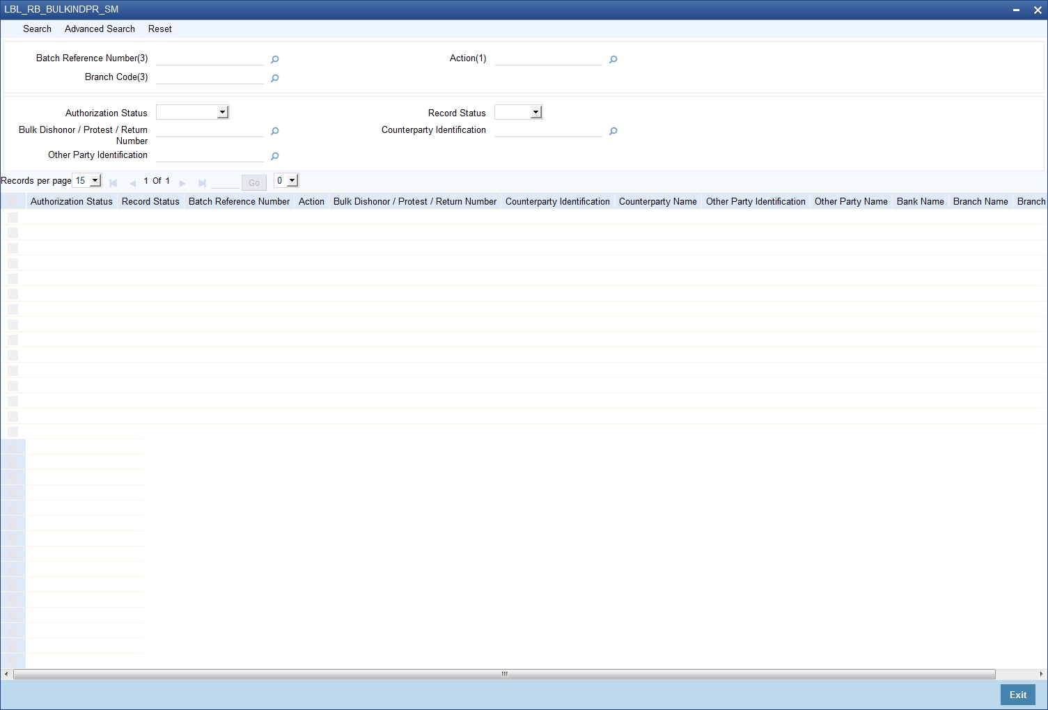 You can view a summary of inward bulk dishonour, protest or return in ‘Retail Bills - Inward Bulk Dishonor - Protest - Return Summary’ screen. To invoke this screen, type ‘RBSBIDPR’ in the field at the top right corner of the application toolbar and click the adjoining arrow button.