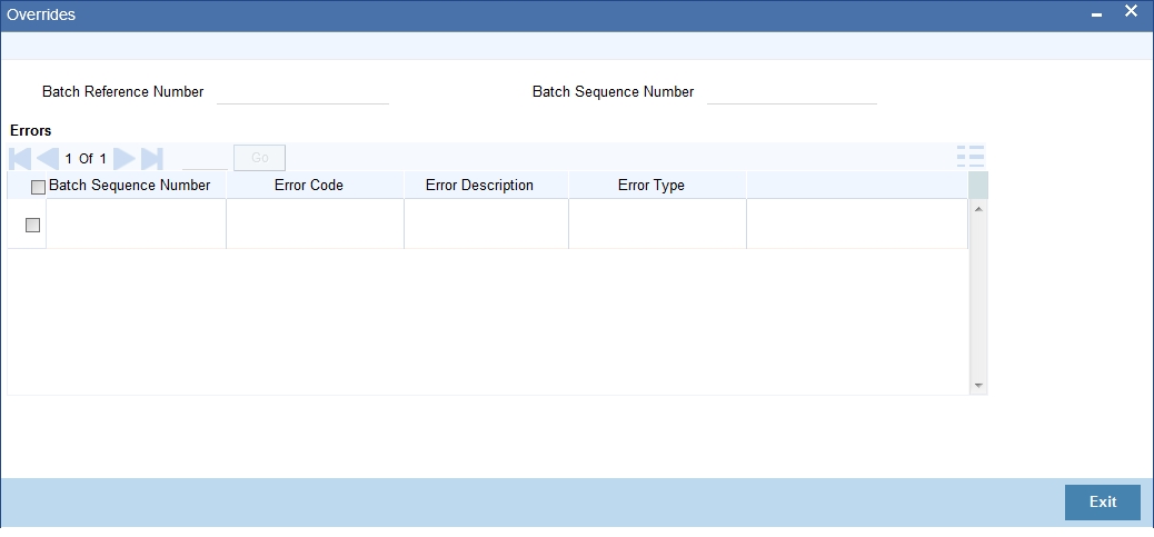 You can view the errors and overrides that took place in the bulk overseas cheque booking process using ‘Overrides’ screen. Click ‘Show Errors’ button to invoke this screen.