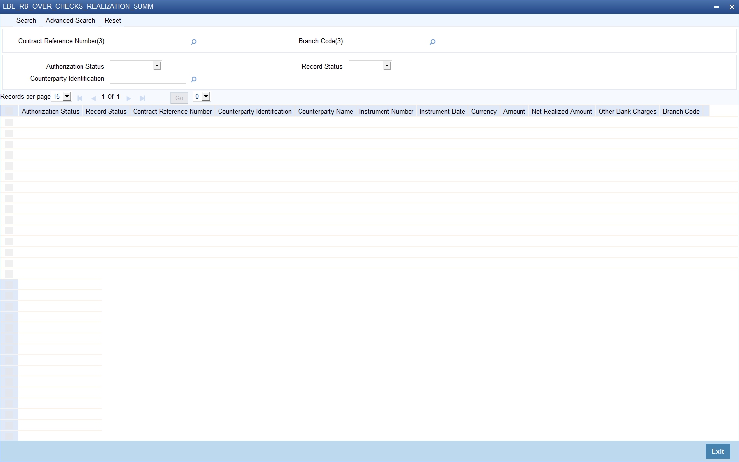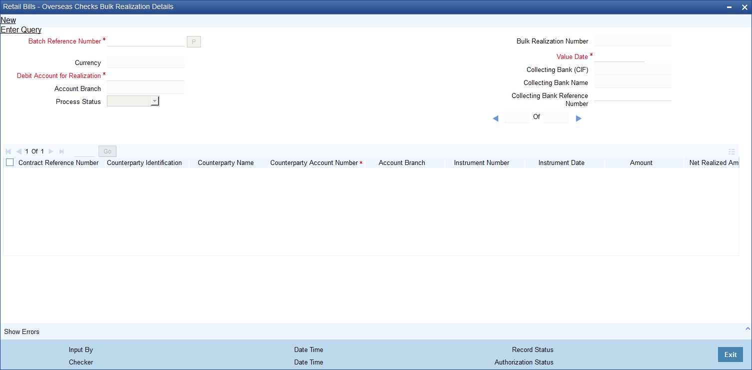 You can realize all overseas cheques sent under a batch using 'Retail Bills-Overseas Cheques Bulk Realization Details' screen. This screen allows you to identify a batch under which the selected set of instruments will be realized.