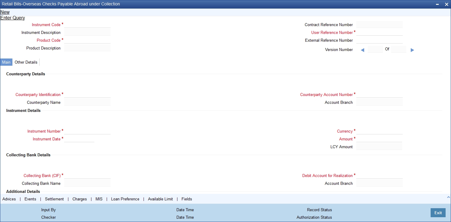 For capturing additional details, an array of buttons are provided at the bottom of ‘Retail Bills - Overseas Cheques Payable Abroad under Collection’ screen. You can capture the following additional details for a cash letter contract: