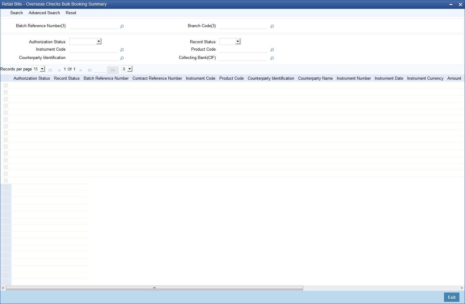 You can view a summary of bulk booking of overseas cheques payable abroad under collection using ‘Retail Bills - Overseas Checks Bulk Booking Summary’ screen. To invoke this screen, type ‘RBSBOCPA’ in the field at the top right corner of the application toolbar and click the adjoining arrow button.