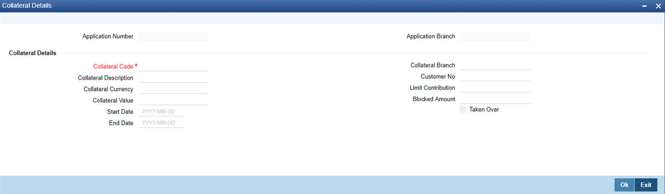 For details on Collaterals, refer to the section ‘Collateral Maintenance’ in the chapter 'Limits and Collaterals' in Limits and Collateral Management User Manual.