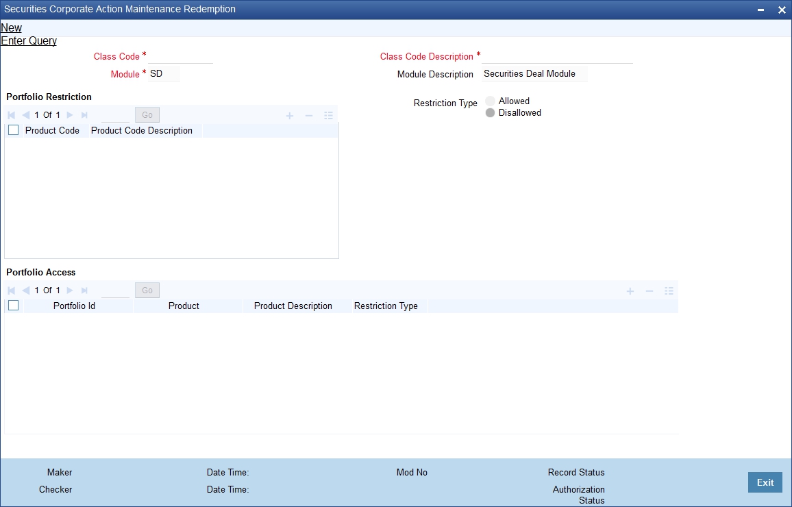 You can invoke the Portfolio Restriction Class Maintenance screen from the Application Browser. If you are maintaining details of a new portfolio restriction class, click new icon on the tool bar. The Portfolio Restrictions Class Maintenance screen is displayed without any details.