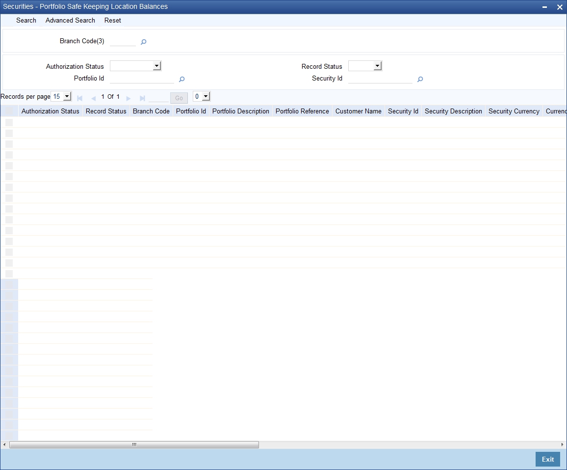 You can view the portfolio safe keeping location balances of securities in the 'Securities - Portfolio Safe Keeping Location Balances Summary' screen. You can invoke this screen by typing 'SESXPFSB' in the field at the top right corner of the Application tool bar and clicking on the adjoining arrow button.