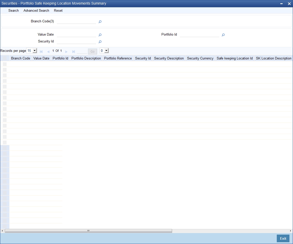 You can view the portfolio safe keeping location balances of securities in the 'Securities - Portfolio Safe Keeping Location Movements Summary' screen. You can invoke this screen by typing 'SESXPSMV' in the field at the top right corner of the Application tool bar and clicking on the adjoining arrow button.