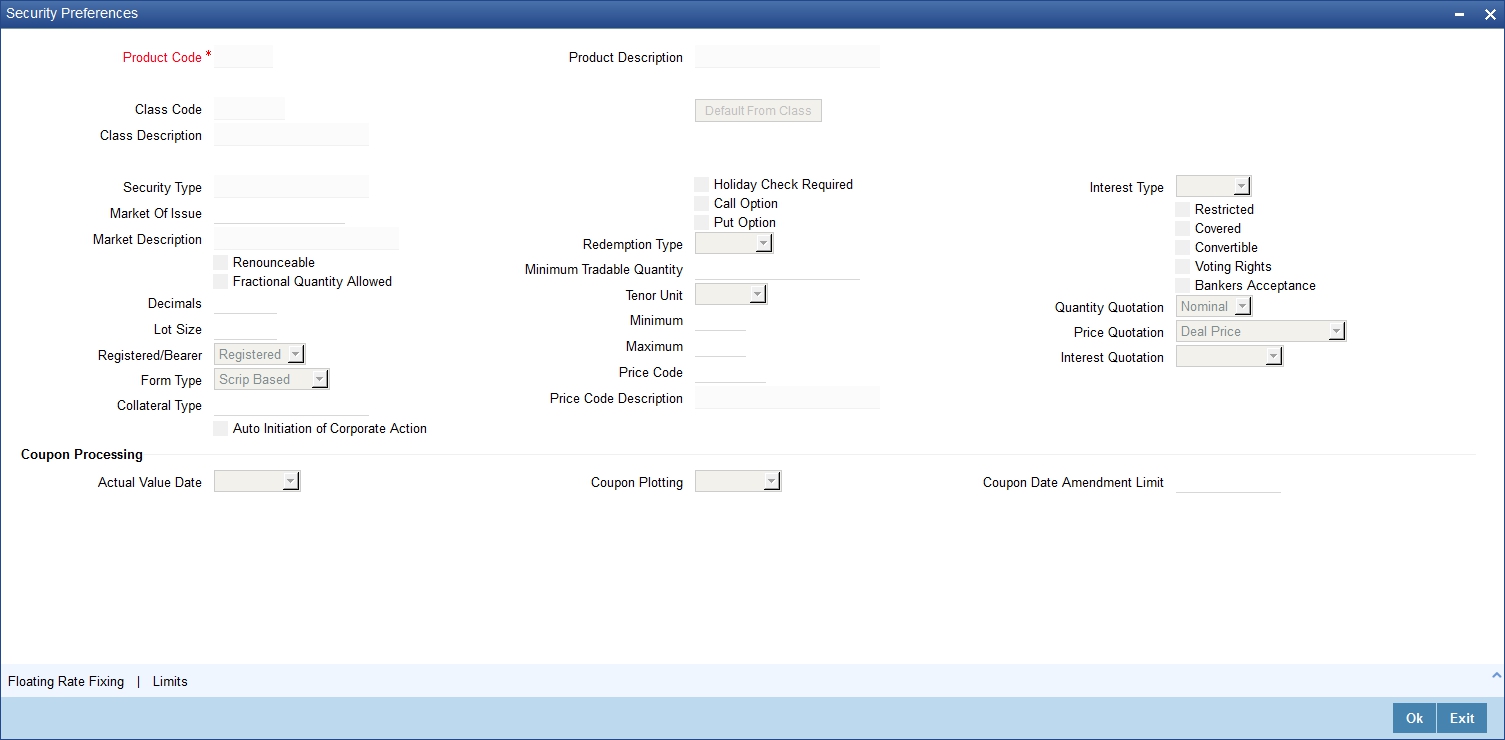 A Security Product is a category or a type of security. For instance, you can define short term zero coupon bonds in the local currency, as a product in Oracle FLEXCUBE. Similarly, you can define Rights as a product. A security product, thus, serves to classify the securities that you deal in.