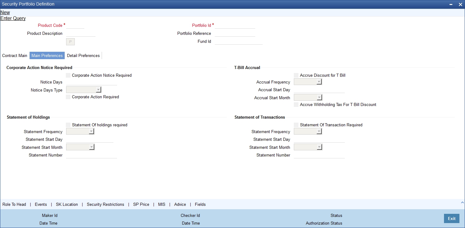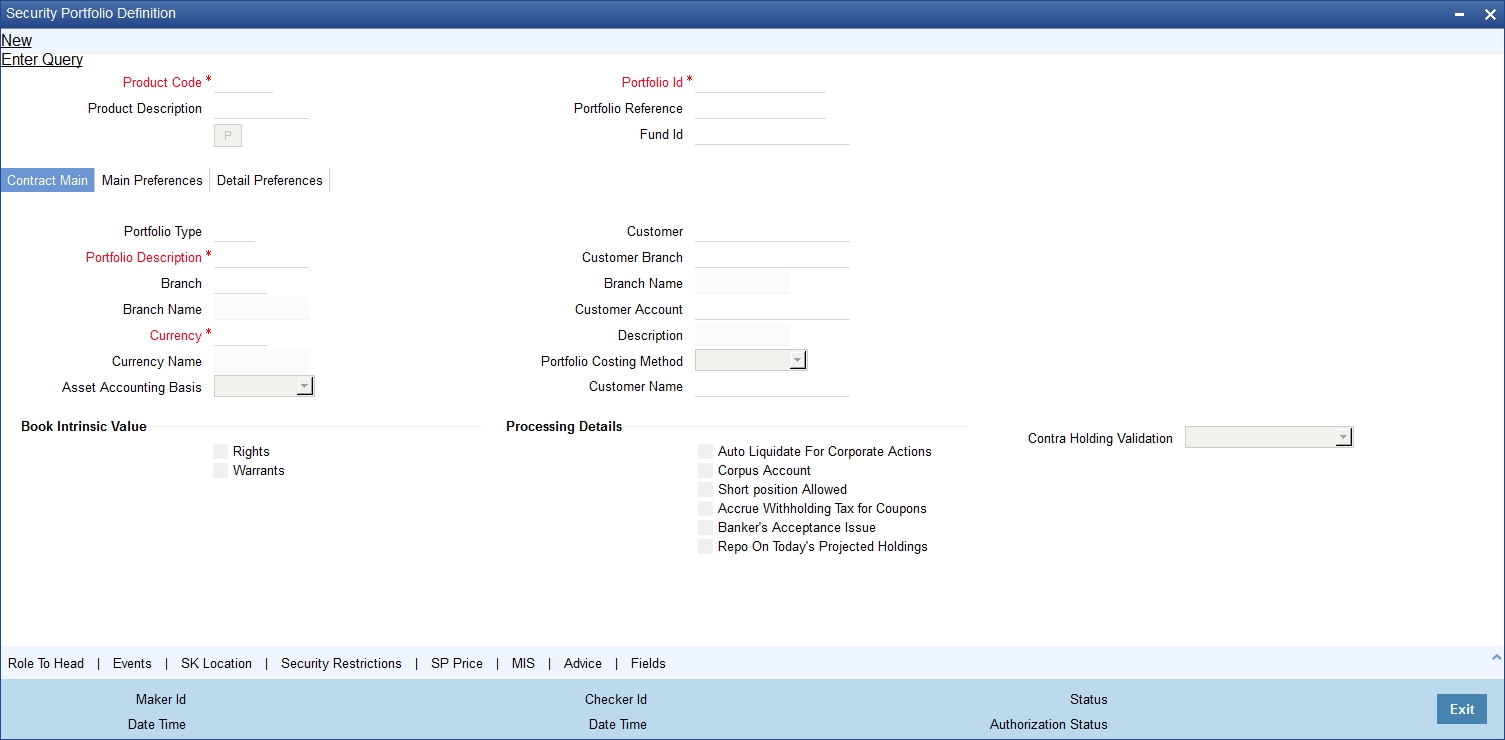 The Securities Portfolio Definition screen consists of a header, a footer containing fields that are specific to the portfolio you are defining and three tabs (Contract main, Main preferences and the Detail preference).