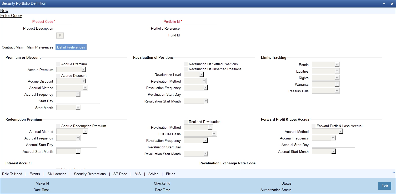 You can also specify restrictions on the securities that the portfolio can trade in. The preferences (that involve accounting entries) specified for a product is defaulted. These preferences cannot be changed.