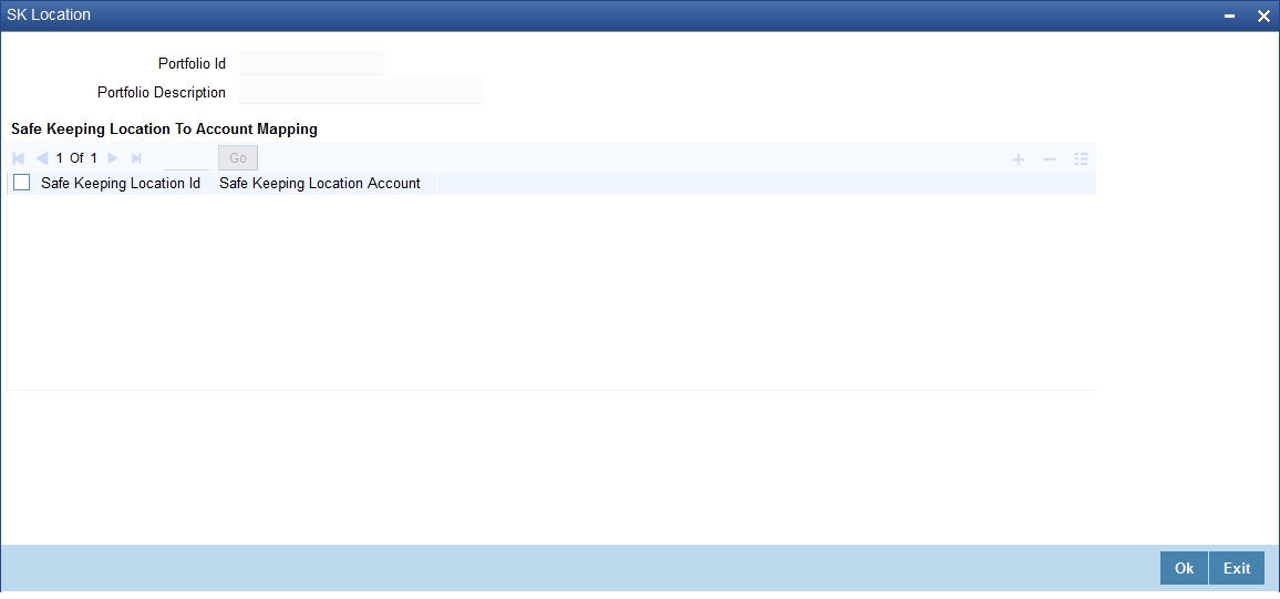Click ‘SK Location’ from the Portfolio Definition screen to invoke the Safe Keeping Location screen. In this screen you can indicate the default account to be used for each SK location.