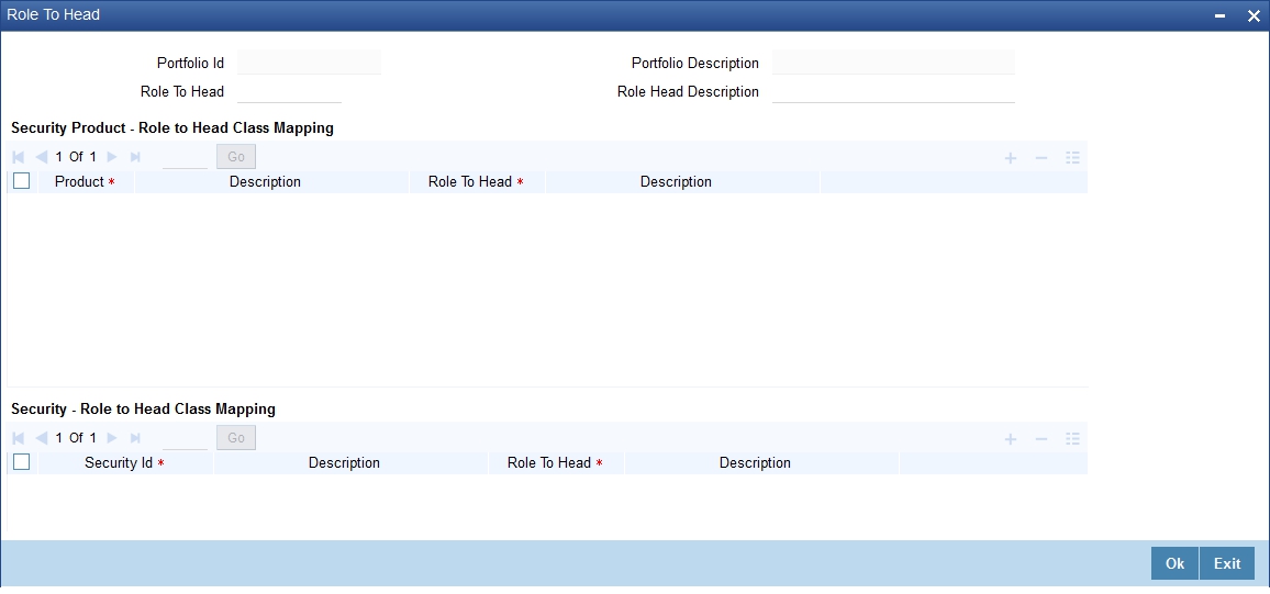 While creating a product, you have specified Role to Head Mapping preferences. The preferences specified for the product associated with the portfolio is defaulted. Click ‘Role to Head’ from the Securities Portfolio Definition screen.
