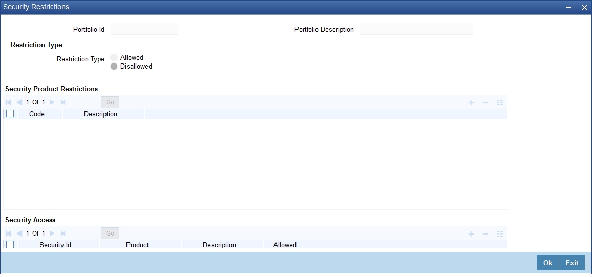 Click ‘Security Restrictions’ button from the Portfolio Definition screen, to invoke the Security Restrictions screen.