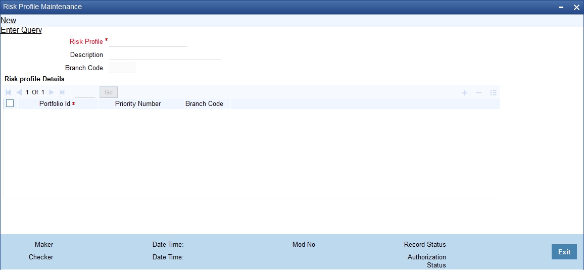You can maintain risk profiles in the Risk Profile Maintenance screen. To invoke this screen To invoke the screen, type 'SEDXRMNT' in the field at the top right corner of the application toolbar and click the adjoining arrow button.