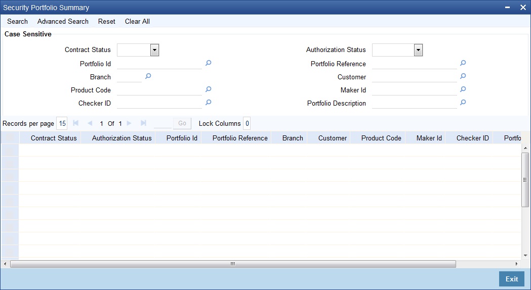 You can view the portfolio details in the ‘Security portfolio Summary’ screen. To invoke this screen, type ‘SESXPFNL’ in the field at the top right corner of the Application tool bar and click the adjoining arrow button.