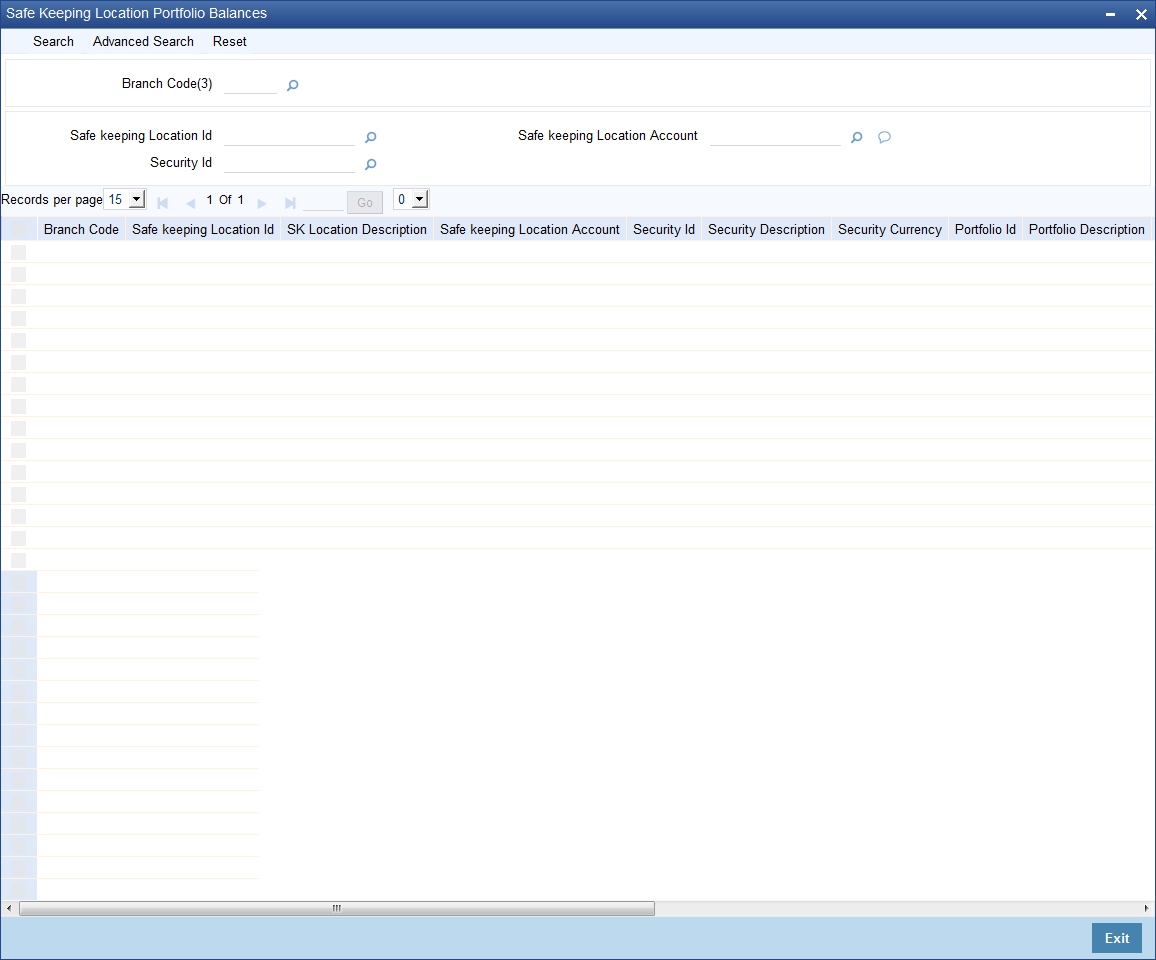 You can view the safe keeping location portfolio balances in the 'Safe Keeping Location Portfolio Balances Summary' screen. You can invoke this screen by typing 'SESXSKPB' in the field at the top right corner of the Application tool bar and clicking on the adjoining arrow button.