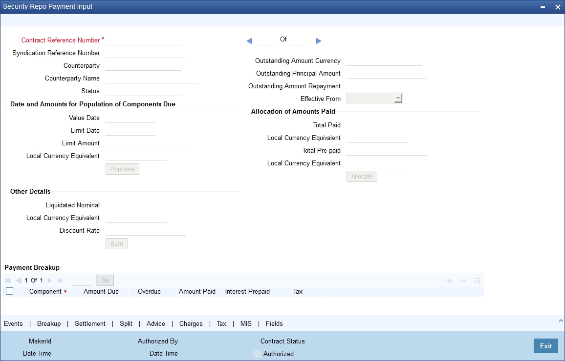 You can maintain the details for security repo payment in the 'Security Repo Payment Input' screen. To invoke the screen, type 'SRDPAMIN' in the field at the top right corner of the application toolbar and click the adjoining arrow button.