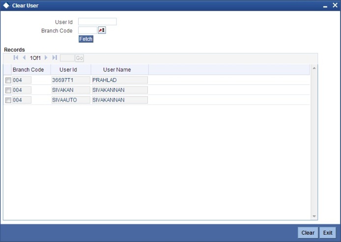 You can invoke the ‘Clear User’ screen by typing ‘CLRU’ in the field at the top right corner of the Application tool bar and clicking the adjoining arrow button. The following screen will be displayed: