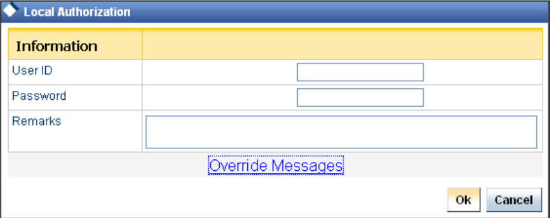 The overrides have to be authorized by the supervisor and depending on the Workflow structure, will be ‘Manual – Local/Remote’ or ‘Auto’. By default, remote authorization will be selected. However, you can select local authorization. When you click ‘Local Auth’ button, the ‘Local Authorization’ screen is displayed. The Maker is required to take appropriate action on the main transaction screen.