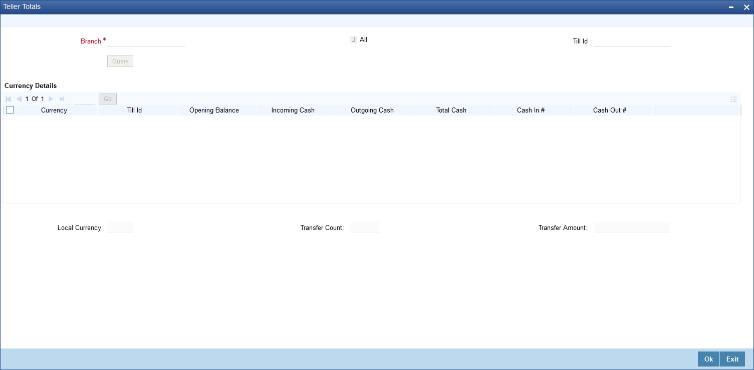 The system checks the ‘All’ check box, by default. It displays the details of all the Till Ids in the corresponding branch.