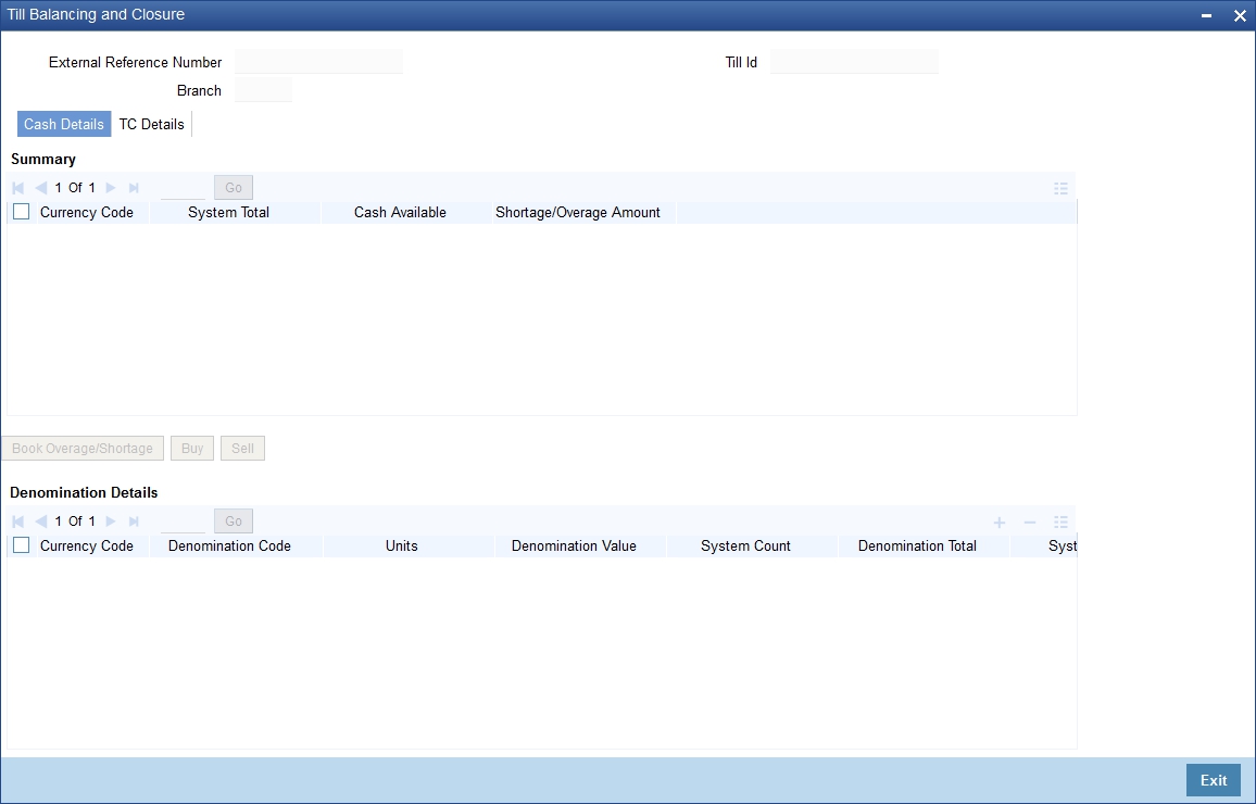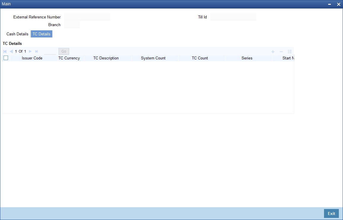 TC Denomination details are available in ‘TC Details’ tab. The field values are defaulted with the currency values handled by the corresponding teller.