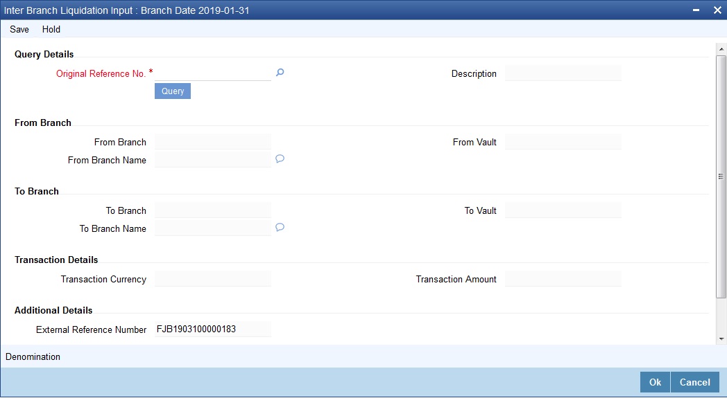 You can transfer cash from source branch to destination branch in the ‘Interbranch Transaction Input’ screen. You can enter vault details to which the cash will be received in this screen.