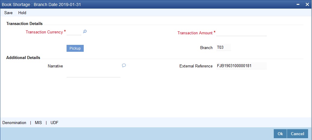 You can book shortage of a currency using the ‘Book Shortage’ screen. You can invoke this screen by typing ‘7551’ in the field at the top right corner of the Application tool bar and clicking on the adjoining arrow button.
