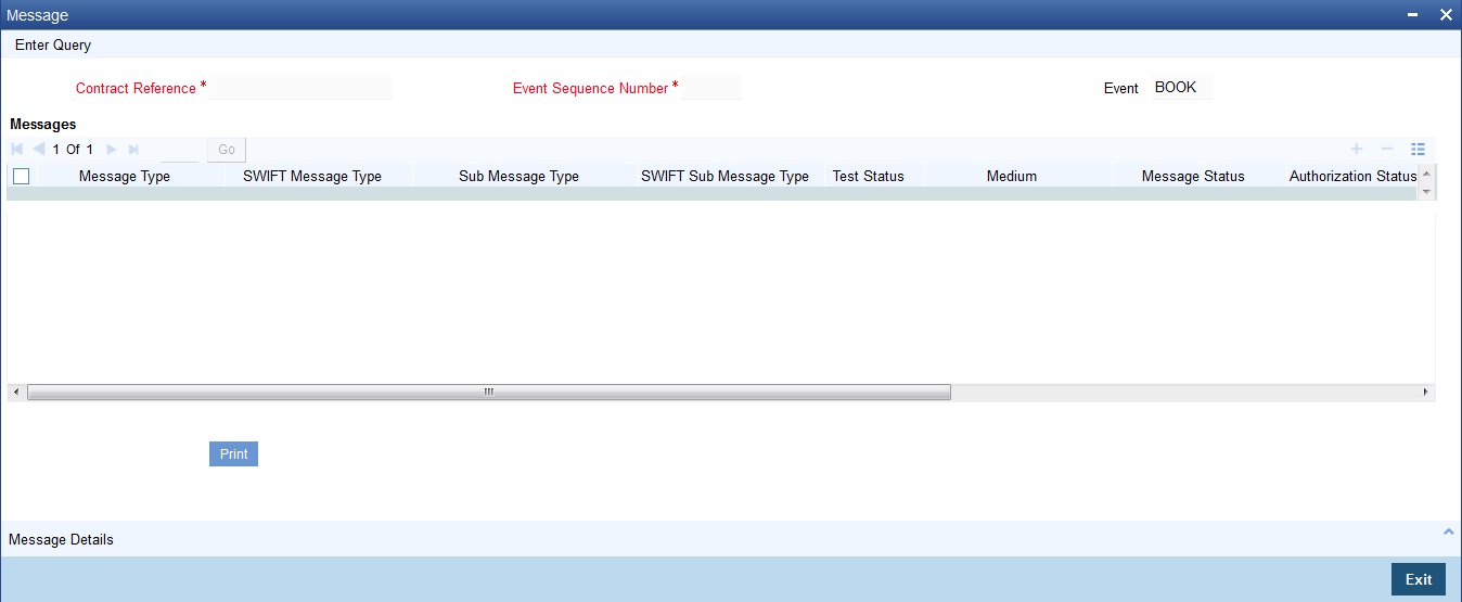 You can preview the advice/message generated for the Inter-Branch Transaction Request using ‘Message’ screen. To invoke this screen, click ‘Message’ button.