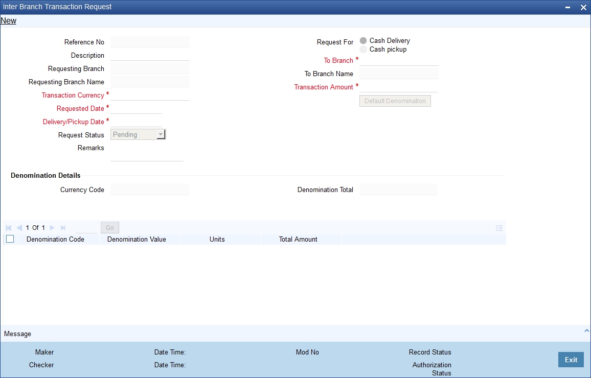 You cannot select these statuses during inter branch transaction request. On click of ‘New’ button, the system defaults the Request Status as ‘Pending’. You cannot edit it.