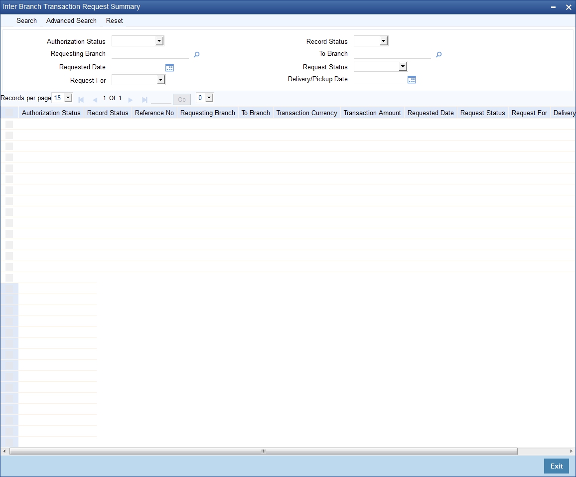 The branch to which the request is raised, acknowledges the request and generates advices for inter branch cash transfer request. Every request is identified by a unique ‘Request Reference Number’, which is automatically generated on save for a new request.