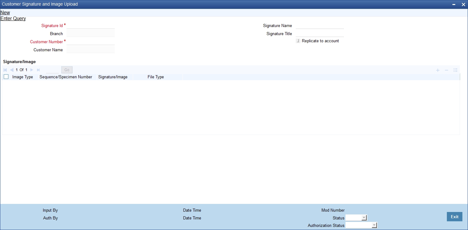 You can upload both signatures and images for a customer using ‘Customer Image and Signature Upload’ screen. Also you can replicate the uploaded signature to customer’s existing accounts.