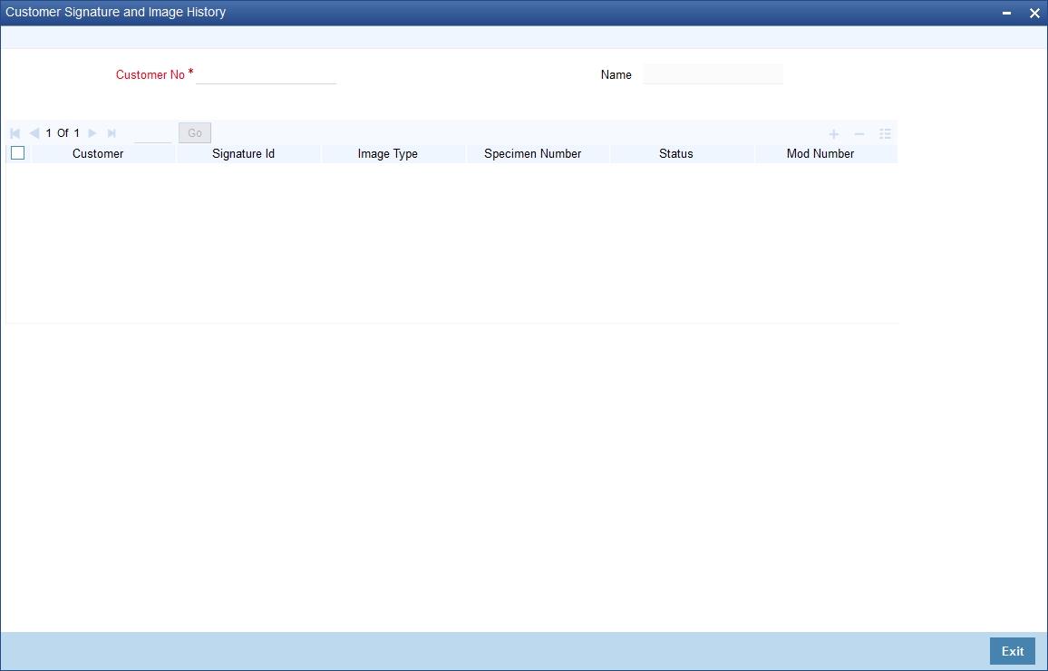 Select the customer number for which you want to view the signature history details, from the adjoining option list. The list displays all valid customers maintained in the system.